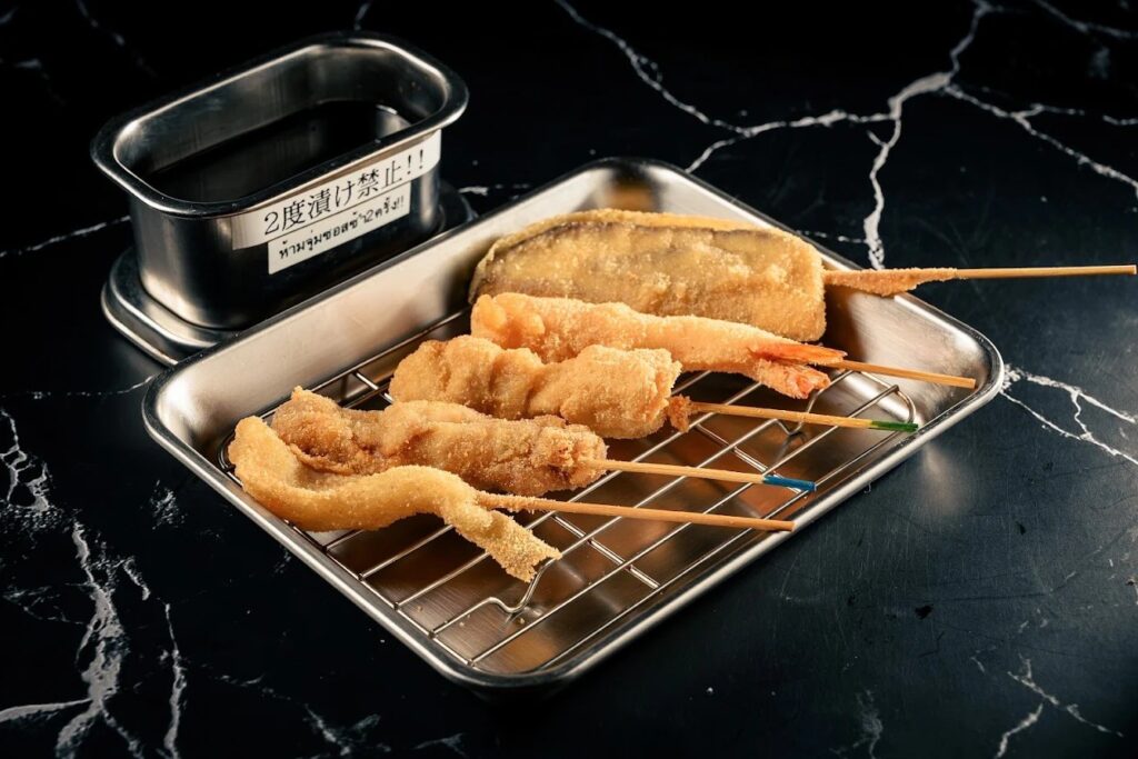 เมนูอาหารของที่นี่มีความหลากหลายจนเลือกไม่ถูก แต่ถ้ามาแล้วจะไม่สั่งไม่ได้เลยคือเมนูเสียบไม้ทอดหรือคูชิคัตสึ (Kushikatsu) ที่มีให้เลือกละลานตา ทานคู่กับเครื่องดื่มเย็นๆ คือที่สุด อีกอย่างที่ถือเป็นซิกเนเจอร์และสร้างคอนเทนต์ได้ดีมากคือ ทาโกะยากิ ที่เราสามารถสนุกกับการลงมือทำเองได้บนเตาที่โต๊ะ เป็นกิจกรรมที่ช่วยสร้างสีสันให้โต๊ะวันเกิดได้ดีมาก ส่วนสายปลาดิบต้องลองสั่งพรีเมียมซาซิมิเซ็ตที่ความสดส่งตรงจากญี่ปุ่น หรือจะเป็นเมนูหม้อไฟที่ให้ปริมาณจัดเต็ม แบ่งกันทานได้หลายคนคุ้มค่าสุดๆ
