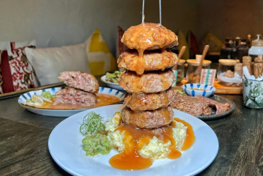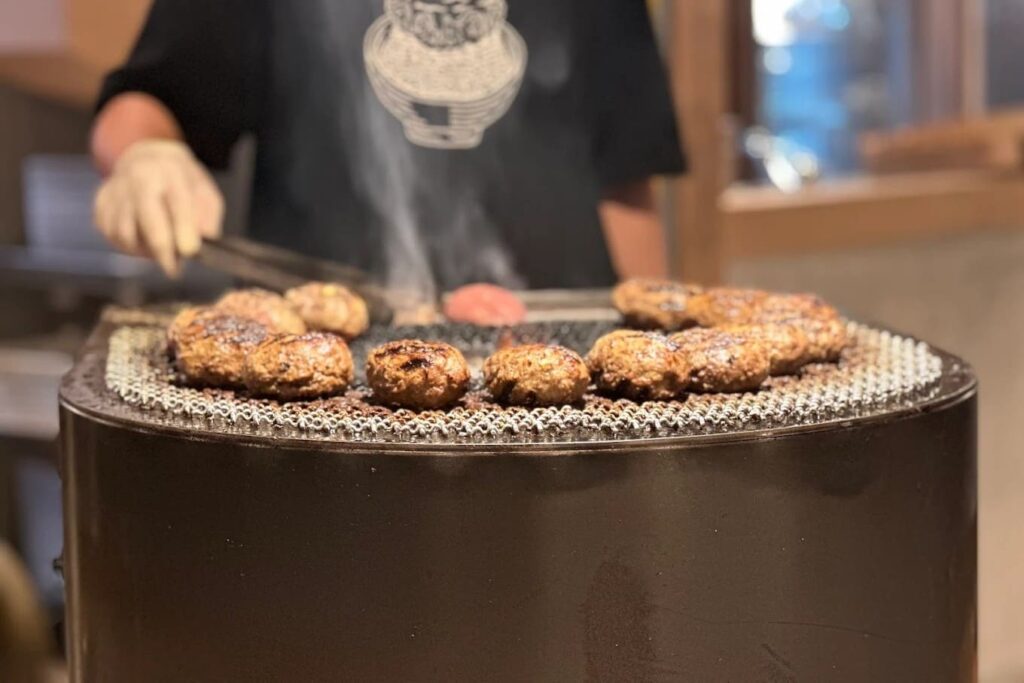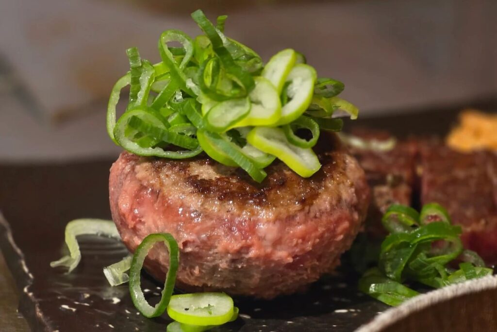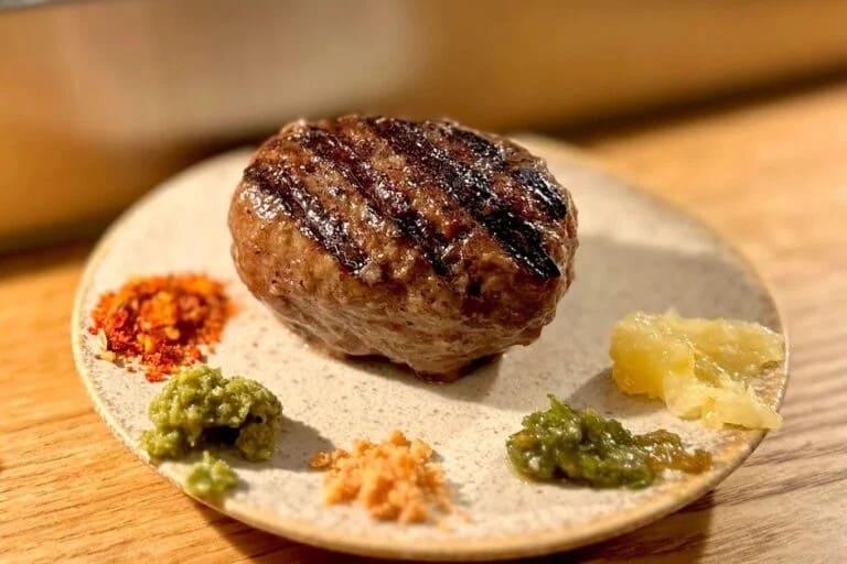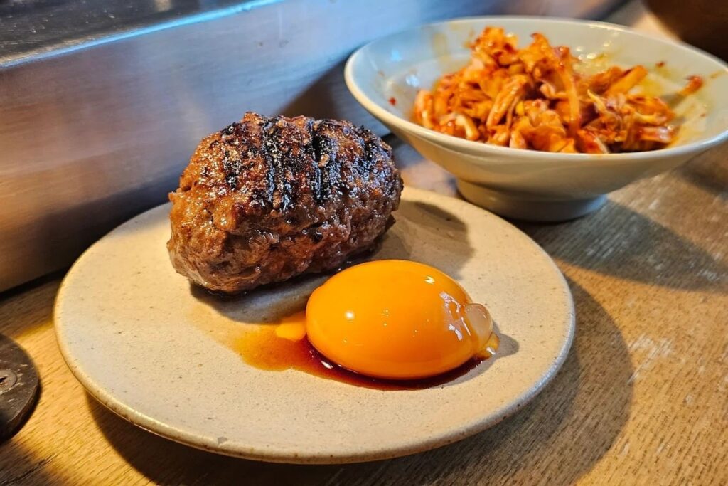 หัวใจสำคัญของที่นี่มีเพียงเมนูเดียวที่เป็นพระเอกคือเซตแฮมเบิร์กเนื้อวัว ในหนึ่งชุดจะเสิร์ฟมาให้ทั้งหมดสามก้อนใหญ่ๆ โดยเชฟจะค่อยๆ ย่างแล้วนำมาเสิร์ฟบนตะแกรงตรงหน้าเราทีละก้อน เพื่อให้เราได้สัมผัสรสชาติในช่วงเวลาที่ดีที่สุด ก้อนแรกแนะนำให้ลองชิมแบบเพลียวๆ เพื่อรับรสสัมผัสความหวานของเนื้อและกลิ่นควันถ่าน ก้อนที่สองลองทานคู่กับไชเท้าขูดและพอนซึเพื่อให้ความสดชื่น ส่วนก้อนสุดท้ายต้องจบด้วยการวางเนื้อลงบนข้าวสวยร้อนๆ แล้วตอกไข่ดิบคุณภาพดีลงไปผสม ซึ่งไข่แดงของที่นี่มีความหนึบและเข้มข้นเป็นพิเศษ