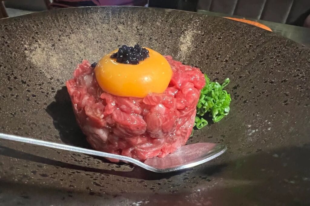 จุดเด่นที่ทำให้หลายคนติดใจคือการนำเสนอที่ดูเรียบง่ายแต่รสชาติซับซ้อน ตัวก้อนเนื้อวางมาบนซอสสูตรลับของทางร้านที่มีรสสัมผัสกลมกล่อมและช่วยดึงความหวานของเนื้อวากิวออกมาได้ชัดเจนยิ่งขึ้น ยิ่งพอได้เจาะไข่แดงสดที่วางท็อปมาด้านบนให้ไหลเยิ้มลงมาเคลือบชิ้นเนื้อ ความมันนัวของไข่จะเข้าไปผสมผสานกับความเข้มข้นของซอส สร้างประสบการณ์การทานที่นุ่มละมุนลิ้นเหมือนละลายได้ในปาก