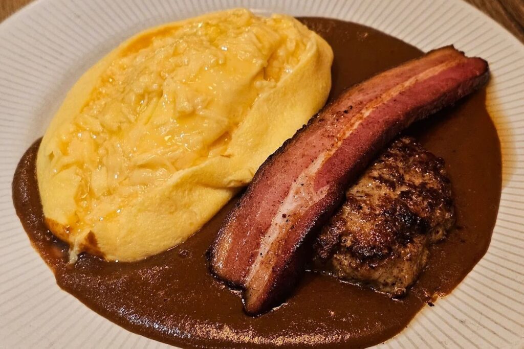 เมนูที่พลาดไม่ได้เลยคือแฮมเบิร์กราดซอสเดมิกลาสสูตรเข้มข้นที่เป็นซิกเนเจอร์ของร้าน ตัวซอสมีความมันวาวและรสชาติที่ลุ่มลึกจากการเคี่ยวเค็มหวานอย่างลงตัว หรือถ้าใครชอบความจัดจ้านขึ้นมาหน่อยก็มีตัวเลือกอย่างแฮมเบิร์กแกงกะหรี่ที่ให้กลิ่นอายความเผ็ดร้อนของเครื่องเทศสไตล์ญี่ปุ่น ตัดเลี่ยนได้ดีมาก นอกจากนี้ยังมีเมนูที่ผสมผสานความหลากหลายอย่างแฮมเบิร์กเสิร์ฟคู่กับกุ้งทอดกรอบตัวโต หรือจะเลือกแบบที่โปะหน้าด้วยชีสเยิ้มๆ และไข่ดาวสุกกำลังดีก็ช่วยเพิ่มความฟินได้อีกระดับ