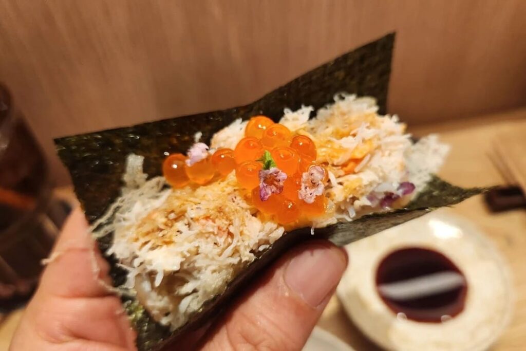 เมนูอาหารที่ห้ามพลาดคือบรรดาแฮนด์โรลหลากหลายหน้าที่มีความเฉพาะตัวสูงอย่าง Chutoro Uni & Caviar ที่รวบรวมวัตถุดิบชั้นเลิศสามอย่างมาไว้ในคำเดียวให้รสสัมผัสที่ทั้งหวานมันและเข้มข้น หรือจะเป็น Hotate with Ankimo Sauce ที่ใช้หอยเชลล์ตัวโตท็อปด้วยซอสตับปลาอังคิโมะรสละมุน สำหรับสายโอมากาเสะทางร้านยังมี New Seasonal Omakase Course ที่จัดเต็มทั้งปลามาได ปลาฮามาจิ และปลาโนโดกุโระที่เสิร์ฟพร้อมครีมชีสและไข่ปลาคาเวียร์ ในราคาเริ่มต้นที่ 2,690 บาทต่อคอร์ส นอกจากนี้ยังมีเมนูไฮไลต์อย่าง Awabi with Kimo Awabi Sauce ที่เสิร์ฟเป๋าฮื้อพร้อมซอสเข้มข้นในฝาหอยดูหรูหรา วัตถุดิบทุกอย่างถูกคัดสรรมาอย่างดีและห่อด้วยสาหร่ายคุณภาพที่ยังคงความกรอบไว้ได้นาน สำหรับราคาต่อหัวโดยเฉลี่ยหากสั่งเป็นจานเดี่ยวจะอยู่ที่ประมาณ 800-1,500 บาท แต่ถ้าจัดคอร์สเต็มรูปแบบจะอยู่ที่ประมาณ 3,000 บาทขึ้นไป