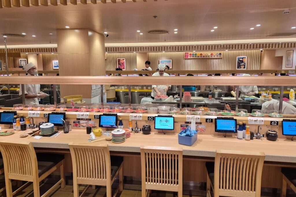 เมนูอาหารที่ห้ามพลาดและถือเป็นไฮไลต์เด็ดคือ แซลมอนโทโระย่างไฟที่ให้ความหอมมันของไขมันปลาแบบเต็มคำ หรือจะเป็นกลุ่มเมนูจัมโบ้อย่าง ชูโทโระจัมโบ้ ที่มักจะมีโปรโมชั่นสุดคุ้มให้สายทูน่าได้ฟินกันแบบจุใจ นอกจากซูชิที่มีหน้าให้เลือกมากกว่า 80 ชนิดแล้ว ของทอดอย่างกุ้งเทมปุระนิกิริและปลาหมึกเทมปุระก็ทำออกมาได้กรอบไม่อมน้ำมัน ส่วนเมนูของหวานที่หลายคนติดใจต้องยกให้ พุดดิ้งสไตล์ญี่ปุ่นและวาราบิโมจิที่นุ่มหนึบกำลังดี ราคาอาหารส่วนใหญ่จะเริ่มต้นเพียงจานละ 40 บาทเท่านั้น ทำให้งบประมาณต่อหัวโดยเฉลี่ยจะอยู่ที่ประมาณ 300-600 บาท