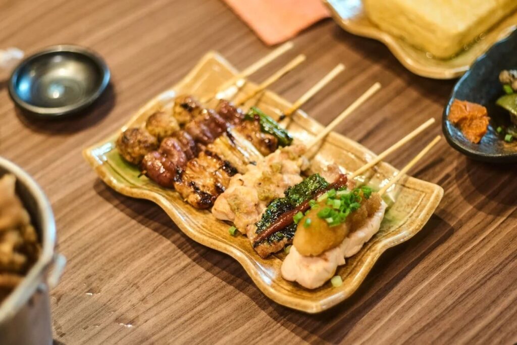 เมนูยากิโทริ (Yakitori) หรือไก่ย่างเสียบไม้ของที่นี่คือทีเด็ดที่ต้องสั่งมาลองเพราะความพิถีพิถันในการเลือกส่วนต่างๆ ของไก่มาปรุงอย่างพอดีคำ โดยเฉพาะสะโพกไก่ที่ย่างมาจนหนังกรอบแต่เนื้อข้างในยังนุ่มชุ่มฉ่ำสุดๆ รสชาติของซอสทาเระมีความหวานเค็มที่ลงตัว ไม่เข้มข้นจนกลบรสชาติธรรมชาติของเนื้อไก่ นอกจากนี้ยังมีเมนูเครื่องเคียงอย่างสลัดมันฝรั่งหรือเมนูผัดผักพื้นบ้านที่ให้รสชาติกลมกล่อมเข้ากันได้ดีกับของย่างร้อนๆ ความโดดเด่นของยากิโทริที่นี่คือกลิ่นหอมของการย่างแบบเฉพาะตัวที่ให้สัมผัสถึงความสดใหม่และคุณภาพของวัตถุดิบในทุกไม้