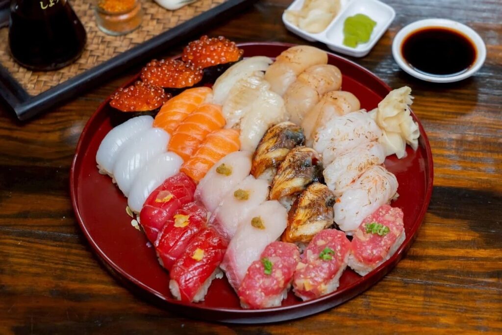 เมนูที่พลาดไม่ได้เลยคือซูชิหน้าต่างๆ ที่ปั้นมาแบบคำต่อคำโดยเน้นความสดของวัตถุดิบที่ส่งตรงมาจากตลาดปลา ความโดดเด่นอยู่ที่มากุโระเนื้อนุ่มสีแดงสด และเอนกาวะที่เบิร์นไฟมาจนหอมมันละลายในปาก นอกจากนี้ยังมีซูชิหน้าไข่ปลาแซลมอนที่กัดแล้วแตกเป๊าะในปากให้รสชาติเค็มๆ มันๆ ที่กลมกล่อมมาก อีกจุดเด่นที่ทำให้หลายคนติดใจคือขิงดองสูตรเฉพาะของร้านที่ช่วยตัดเลี่ยนได้เป็นอย่างดี รวมถึงซุปมิโซะร้อนๆ ที่เสิร์ฟมาให้ซดแก้คอแห้งควบคู่ไปกับการดื่มด่ำกับรสชาติของปลาทะเลนานาชนิด