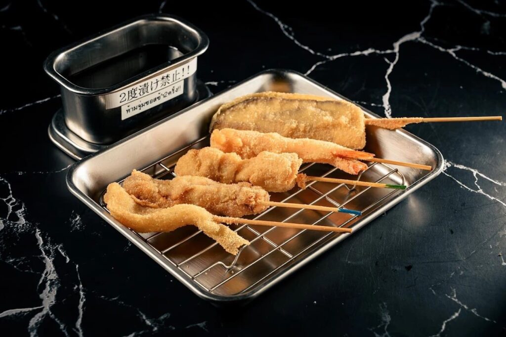 เมนูที่เป็นหัวใจหลักของร้านต้องยกให้คุชิคัตสึ (Kushikatsu) หรือของทอดเสียบไม้ที่มีให้เลือกละลานตามาก ทั้งเนื้อสัตว์ ผัก และชีส จุดเด่นอยู่ที่แป้งทอดกรอบสีเหลืองทองที่บางเบาแต่กรอบไม่ซึมน้ำมัน จิ้มกับซอสสูตรเข้มข้นที่รสชาติเข้ากันได้ดีมาก อีกเมนูที่ไม่ควรพลาดคือโอเด้งที่ต้มในน้ำซุปร้อนๆ จนซึมเข้าเนื้อ หรือจะสั่งเมนูราคาย่อมเยาอย่างซาซิมิปลาแซลมอนเนื้อฉ่ำและข้าวหน้าแกงกะหรี่มาเติมให้อิ่มท้องก็ถือเป็นทางเลือกที่คุ้มค่าสุดๆ นอกจากนี้ยังมีเครื่องดื่มเย็นๆ หลากหลายชนิดที่เสิร์ฟมาในแก้วแช่เย็นจัดช่วยชูรสชาติของทอดให้เด่นชัดยิ่งขึ้น