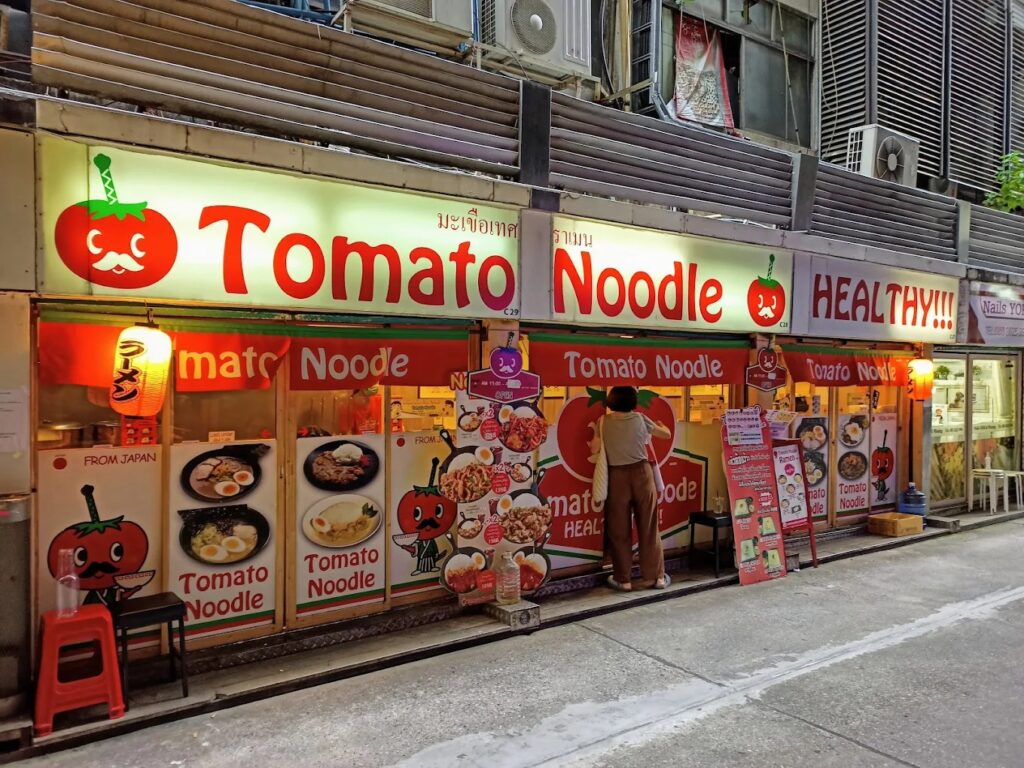 ร้านนี้คือที่สุดของความแปลกใหม่และถูกปากคนรักสุขภาพที่แอบอยากกินของอร่อย ในซอยธนิยะเลย ร้าน Tomato Noodle ไม่ใช่แค่ร้านราเมงธรรมดา แต่เป็นราเมงซุปมะเขือเทศ ฟังดูอาจจะงง ๆ แต่มันอร่อยลงตัวแบบคาดไม่ถึงเลยนะ จุดเด่นของที่นี่ คือ ซุปมะเขือเทศของร้านจะหอม นัว กลมกล่อม มีรสเปรี้ยวหวานแบบกำลังดี ทำให้ซดได้คล่องคอมาก ๆ ไม่เลี่ยนเลย ใครที่ไม่ค่อยชอบมะเขือเทศแบบจ๋า ๆ ก็ยังกินง่ายมาก แถมยังได้ฟีลลิ่งของการกินอาหารเพื่อสุขภาพด้วย เมนูยอดฮิตคือ บะหมี่เพื่อสุขภาพ (Tomato Noodle Deluxe) ที่มีทั้งหมูย่างและไข่ต้มยางมะตูม แถมยังเพิ่มท็อปปิ้งเป็นชีสยืด ๆ เพื่อเพิ่มความนัวแบบตะวันตกได้อีกด้วย บรรยากาศร้านเป็นแบบเคาน์เตอร์บาร์เล็ก ๆ เหมือนไปนั่งกินที่ญี่ปุ่นเลยล่ะ ราคาต่อหัวจะอยู่ที่ประมาณ 200-300 บาท