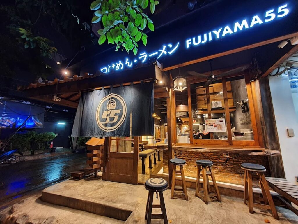 Taishoken Ramen เป็นร้านราเมงระดับตำนานที่ต้องมาลองในย่านทองหล่อ เพราะเป็นร้านต้นตำรับผู้คิดค้นเมนูสึเคเมน (Tsukemen) เจ้าแรกของญี่ปุ่นที่มีอายุยาวนานกว่า 50 ปี จุดเด่นอยู่ที่เส้นราเมงขนาดใหญ่แบบเหลี่ยมที่เหนียวนุ่มหนึบหนับสุดๆ เคี้ยวสู้ฟัน และน้ำซุปเข้มข้นจากการเคี่ยวกระดูกหมูและปลาทะเลนานเกือบ 2 วัน ทำให้ได้รสชาติกลมกล่อม หอมกลิ่นปลาแห้งอ่อนๆ เมนูซิกเนเจอร์ที่ห้ามพลาดคือ Tonkotsu Tsukemen สึเคเมนซุปกระดูกหมู ที่เสิร์ฟพร้อมน้ำซุปดาชิใสๆ ไว้เติมลดความเข้มข้นได้ตามชอบ หรือจะเป็น Tonkotsu Kakuni Ramen ที่ซุปหอมเข้มข้น โปะหน้าด้วยหมูสามชั้นนุ่มละลายในปาก ร้านตั้งอยู่ที่ Fifty Fifth Thonglor ชั้น 1 ในซอยสุขุมวิท 55 มีราคาต่อหัวอยู่ที่ประมาณ 200-400 บาท