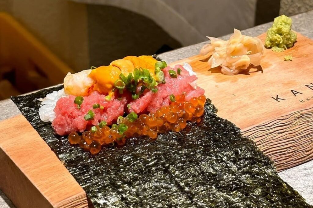 Kin Roll เน้นการนำเสนอแฮนด์โรลในสไตล์มินิมอลที่เน้นความสดใหม่ของวัตถุดิบเป็นหัวใจสำคัญ มีจุดขายที่เป็นเอกลักษณ์คือความใส่ใจในการรักษาอุณหภูมิของข้าวที่ต้องพอเหมาะกับชนิดของปลาที่ใช้ เพื่อให้รสสัมผัสมีความสมดุลและดึงความหวานตามธรรมชาติของปลาออกมาได้ดีที่สุด ทางร้านเลือกใช้สาหร่ายแผ่นหนาเกรดนำเข้าที่ย่างใหม่ๆ จนส่งกลิ่นหอมฟุ้งไปทั่วเคาน์เตอร์บาร์ เมนูแนะนำที่ถือเป็นซิกเนเจอร์ประจำร้านคือ ฮามาจิยูซุโคโช (Hamachi Yuzukoso) แฮนด์โรลปลาฮามาจิเนื้อเด้งที่เพิ่มความสดชื่นด้วยรสเผ็ดเล็กน้อยและกลิ่นหอมจากเปลือกส้มยูซุ หรือจะเป็นอูนิแฮนด์โรล ที่คัดเฉพาะไข่หอยเม่นเกรดพรีเมียมวางมาแบบพูนๆ ให้ความครีมมี่ละมุนไปทั่วทั้งคำ ร้านมีหลายสาขากระจายอยู่ทั่วกรุงเทพฯ เช่น สาขาวัน แบงค็อก สาขาอารีย์ สาขาบางนา ราคาต่อหัวจะอยู่ที่ประมาณ 800-1,000 บาท ขึ้นไป เป็นอีกหนึ่งร้านแฮนด์โรลคุณภาพในทำเลสุดชิคที่ควรค่าแก่การมาลิสต์ไว้ในปี 2026