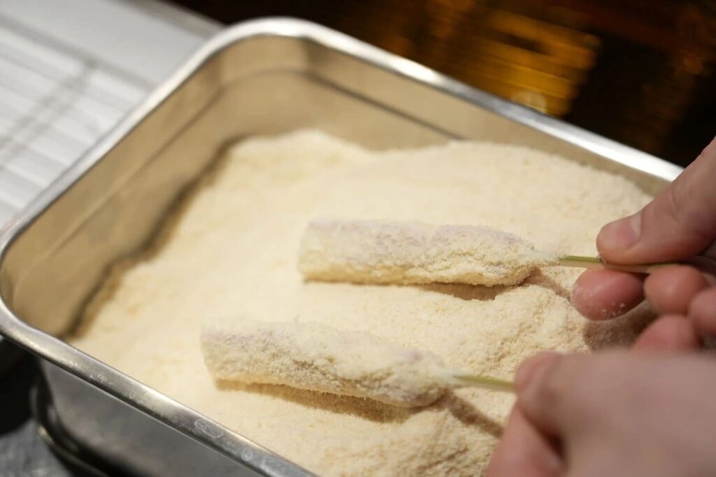 ตัวแป้งที่ใช้ชุบคุชิคัตสึนั้นมีความพิเศษกว่าแป้งชุบทอดทั่วไป สูตรที่แนะนำคือการผสมแป้งสาลีเอนกประสงค์ ไข่ไก่ และน้ำเย็นจัดเข้าด้วยกัน ความเย็นจะช่วยลดการเกิดกลูเตนทำให้แป้งมีความบางเบาและกรอบนานขึ้น เคล็ดลับส่วนตัวคือการเติมผงฟูหรือโซดาลงไปเพียงหยิบมือเพื่อเพิ่มความโปร่งฟูให้กับเนื้อสัมผัส เมื่อผสมจนเข้ากันแล้วให้นำวัตถุดิบที่เสียบไม้ไว้มาชุบแป้งให้ทั่ว ก่อนจะนำไปคลุกกับเกล็ดขนมปังชนิดละเอียดพิเศษ หากหาแบบละเอียดไม่ได้จริงๆ สามารถนำเกล็ดขนมปังทั่วไปมาตำหรือปั่นให้เป็นเม็ดเล็กๆ ก่อนนำมาใช้ วิธีนี้จะช่วยให้คุชิคัตสึมีผิวสัมผัสที่เนียนสวยและไม่อมน้ำมัน