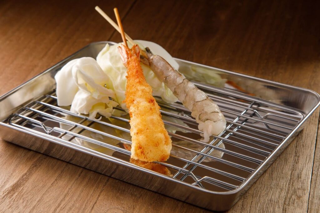 สำหรับสายซีฟู้ด กุ้งเสียบไม้ทอดคือเมนูที่ได้รับความนิยมไม่แพ้เนื้อสัตว์ชนิดอื่น เสน่ห์อยู่ที่ความสดเด้งของเนื้อกุ้งที่ถูกล็อกความฉ่ำไว้ภายใต้เกล็ดขนมปังบางกรอบ เมื่อจุ่มลงในซอสรสเปรี้ยวเค็ม รสหวานของกุ้งจะถูกขับให้เด่นชัดขึ้น นอกจากกุ้งแล้ว ร้านส่วนใหญ่อาจจะมีเมนูหอยเชลล์หรือเนื้อปลาสีขาวที่ให้เนื้อสัมผัสที่เบาและฟู เป็นการเปลี่ยนอารมณ์จากการทานเนื้อแดงมาสู่ความสดชื่นจากท้องทะเลได้อย่างลงตัว