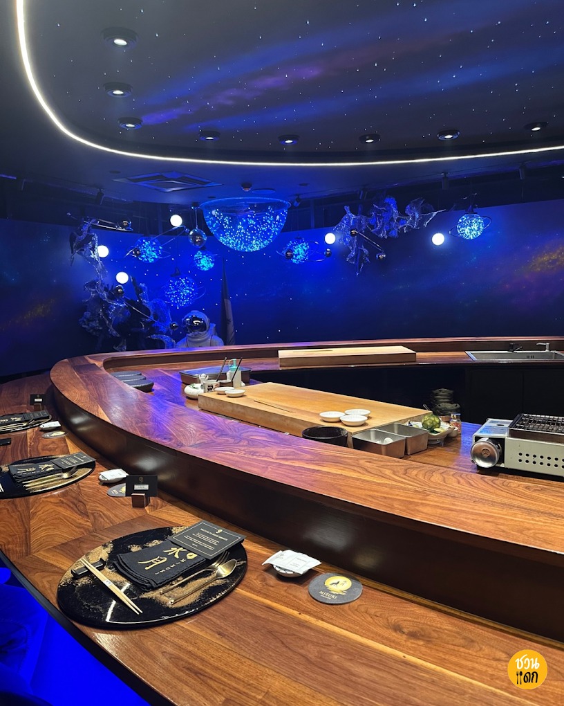 ถ้าอยากลองโอมากาเสะที่แปลกใหม่ไม่เหมือนใครในกรุงเทพฯ แนะนำร้าน Mizuki Omakase ที่สุขุมวิท 31 ร้านนี้แตกต่างจากร้านอื่นๆ ด้วยบรรยากาศที่เหมือนกำลังท่องอวกาศ หรือนั่งทานอาหารอยู่ใต้ดวงจันทร์ มีการตกแต่งร้านที่ล้ำสมัย แถมยังมีบาร์สำหรับจิบเครื่องดื่มเย็นๆ ให้เข้ากับธีมอวกาศด้วย ส่วนวัตถุดิบและรสชาติก็ยังคงพรีเมียม ทางร้านเสิร์ฟโอมากาเสะสไตล์ฟิวชั่น ที่ผสมผสานวัตถุดิบตามฤดูกาลคุณภาพดีจากญี่ปุ่น เข้ากับเทคนิคการปรุงและการนำเสนอที่สร้างสรรค์ ทำให้แต่ละเมนูดูตื่นตาตื่นใจ แถมรสชาติก็ยังอร่อย เมนูซิกเนเจอร์ เช่น Nodoguro Sushi เนื้อปลากระพงท็อปด้วยคาเวียร์ หรือ Bafun Uni อูนิที่หวานละมุนลิ้น