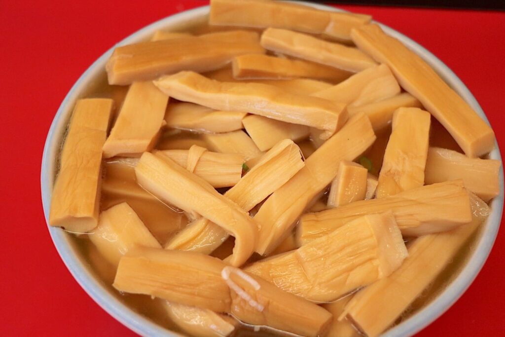 เมมมะ (Menma) คือหน่อไม้ดองที่มีรสสัมผัสกรุบกรอบเป็นเอกลักษณ์ ทำจากการนำหน่อไม้แห้งไปแช่น้ำให้นุ่มแล้วนำไปปรุงรสด้วยน้ำมันงา โชยุ และน้ำตาล หน้าที่หลักของเมมมะในชามราเมงคือการสร้างความแตกต่างทางเนื้อสัมผัส เช่น ในราเมงซุปใสที่เน้นความนุ่มนวล การได้เคี้ยวหน่อไม้ที่มีความกรอบจะช่วยให้การทานสนุกขึ้น ไม่เลี่ยนจนเกินไป และยังให้รสสัมผัสของความเค็มหวานที่สดชื่น
