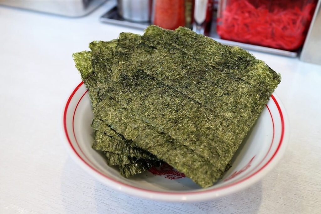 สาหร่ายแผ่นสีดำที่ปักอยู่ข้างชามดูเหมือนจะเป็นแค่ของประดับ แต่ความจริงแล้วสาหร่ายช่วยเพิ่มกลิ่นอายของทะเลให้กับราเมงได้อย่างยอดเยี่ยม เทคนิคการทานของสายกินคือการนำแผ่นสาหร่ายไปจุ่มในน้ำซุปให้พอชุ่มแล้วนำมาห่อเส้นหรือหมูชาชูทานพร้อมกัน กลิ่นหอมของสาหร่ายจะช่วยชูรสชาติของซุปให้ชัดเจนขึ้น หรือในร้านราเมงสไตล์โยโกฮาม่านิยมวางสาหร่ายหลายๆ แผ่นเพื่อให้เรานำไปจุ่มซุปเข้มข้นแล้วทานคู่กับข้าวสวยร้อนๆ เป็นการปิดท้ายมื้ออาหารที่ยอดเยี่ยมที่สุดอย่างหนึ่ง