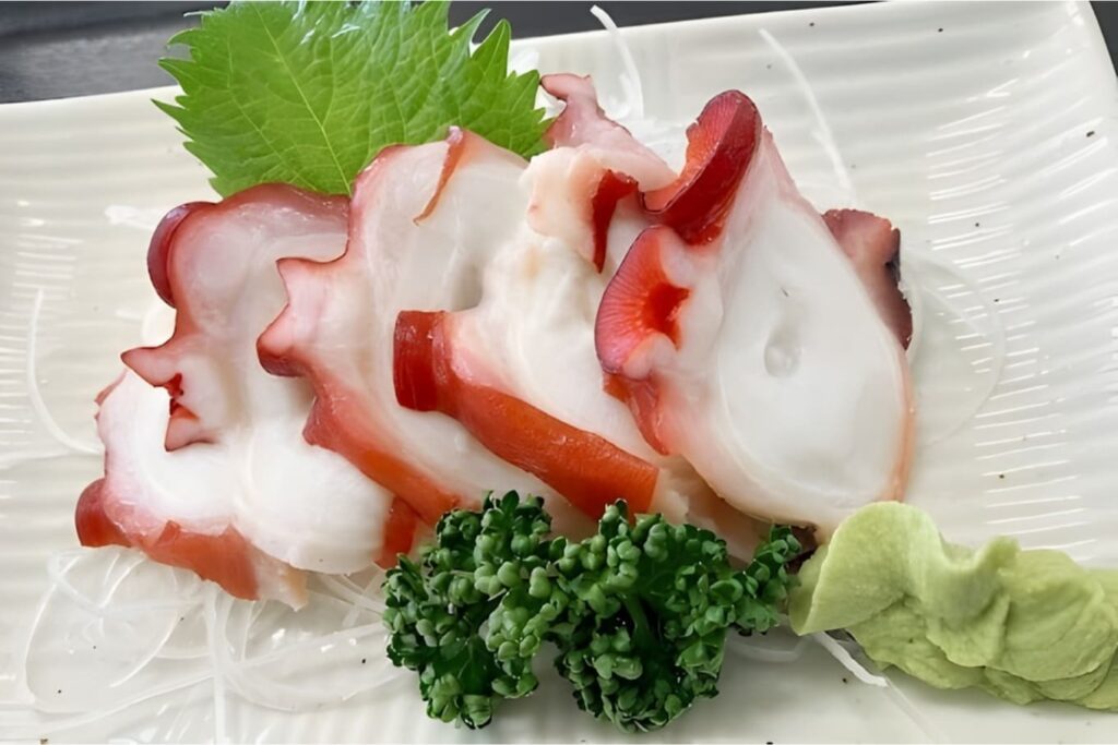 ปลาหมึกยักษ์ทาโกะมักจะถูกนำไปลวกแบบสะดุ้งไฟให้ผิวนอกตึงก่อนจะนำมาแล่เป็นชิ้นบางๆ เพื่อให้ได้เนื้อสัมผัสที่เคี้ยวสนุกและมีความหนึบหนับเป็นเอกลักษณ์ รสชาติของทาโกะจะมีความหวานอ่อนๆ และเข้ากันได้ดีมากกับโชยุเข้มข้น เป็นทางเลือกที่ดีสำหรับคนที่อยากเปลี่ยนบรรยากาศจากเนื้อปลามาเป็นเนื้อสัมผัสที่มีความยืดหยุ่นมากขึ้น
