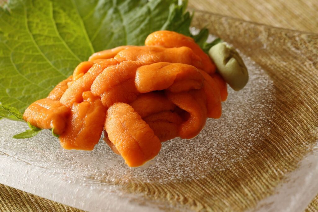 ปิดท้ายด้วยอูนิหรือส่วนอัณฑะและรังไข่ของหอยเม่น ซึ่งถูกยกให้เป็นเนยแห่งท้องทะเล วัตถุดิบชนิดนี้ไม่ได้มาในรูปแบบเนื้อชิ้น แต่จะมาเป็นพูสีเหลืองทองหรือส้มอ่อนที่มีเนื้อสัมผัสแบบครีมมี่ เมื่อเข้าปากจะค่อยๆ ละลายไปกับลิ้น ให้รสชาติที่หวาน มัน และมีความเค็มจากน้ำทะเลจางๆ การทานอูนิแบบซาชิมิเปล่าๆ หรือวางบนแผ่นสาหร่าย ถือเป็นการปิดท้ายมื้ออาหารที่หรูหราและน่าประทับใจที่สุดอย่างหนึ่ง
