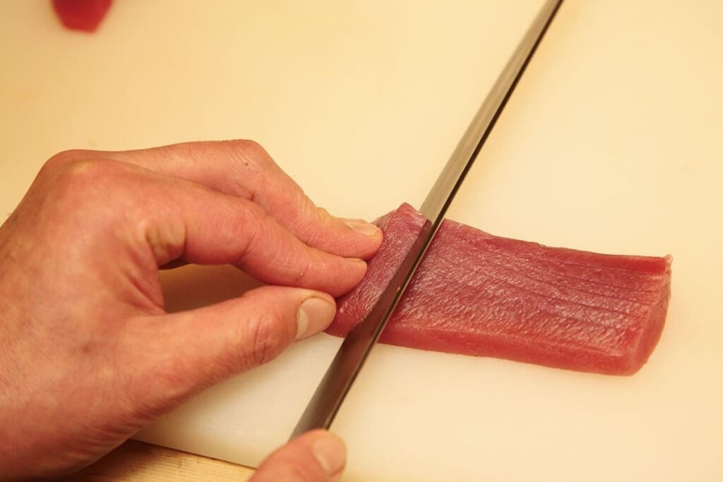 เบื้องหลังชิ้นปลาที่วางเรียงรายอย่างสวยงามไม่ได้มาจากความบังเอิญ แต่เกิดจากทักษะการใช้มีดที่ผ่านการฝึกฝนมาอย่างยาวนาน การหั่นเนื้อปลาแต่ละชนิดมีกรรมวิธีที่แตกต่างกันออกไป เพื่อดึงจุดเด่นของรสสัมผัสและสายพันธุ์ปลานั้นๆ ออกมาให้ชัดเจนที่สุด ศาสตร์การแล่ซาชิมิจึงถือเป็นหัวใจสำคัญที่ตัดสินว่าคำนั้นจะนุ่มละมุนหรือเคี้ยวสนุกเพียงใด