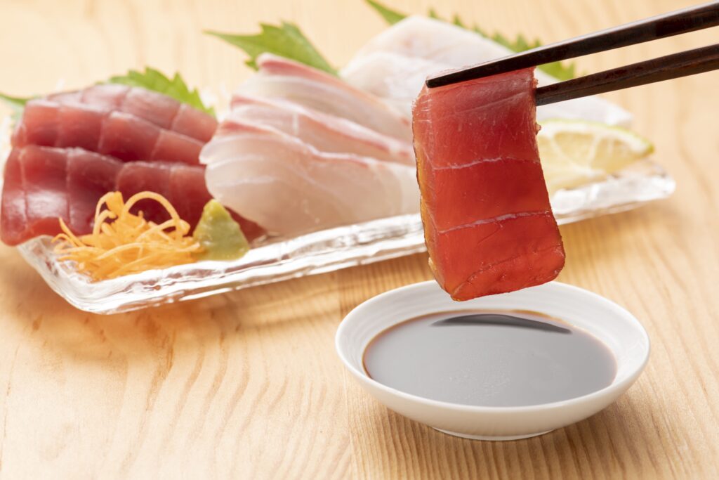 น้ำจิ้มสีเข้มที่เราคุ้นเคยกันดีคือโชยุ แต่สำหรับการทานซาชิมินั้นมักจะให้ความสำคัญกับประเภทของซีอิ๊วมาก โชยุที่ดีสำหรับปลาดิบควรมีบอดี้ที่กลมกล่อม มีความเค็มที่นุ่มนวลและแฝงความหวานจากการบ่มถั่วเหลืองแบบธรรมชาติ ตัวอย่างเช่น ซาชิมิโชยุ ที่มีความเข้มข้นสูงและมีความหนืดเล็กน้อย เพื่อให้เกาะติดกับเนื้อปลาได้ดีโดยไม่ไหลทิ้ง วิธีการใช้ที่ถูกต้องคือการแตะโชยุเพียงเล็กน้อยที่ปลายเนื้อปลา เพื่อให้รสเค็มไปกระตุ้นการรับรสโดยไม่กลบกลิ่นหอมอันเป็นเอกลักษณ์ของวัตถุดิบหลัก