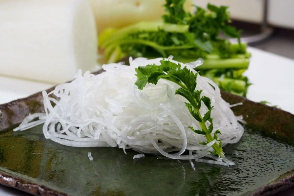 หลายคนมักจะเหลือหัวไชเท้าขูดขาวๆ และใบไม้สีเขียวขอบหยักทิ้งไว้บนจาน แต่รู้หรือไม่ว่า สึมะ (Tsuma) หรือกลุ่มเครื่องเคียงผักสดเหล่านี้มีประโยชน์มาก หัวไชเท้าขูดฝอยช่วยให้ความรู้สึกสดชื่นและมีเอนไซม์ที่ช่วยในการย่อยอาหารประเภทโปรตีน ส่วนใบชิโซะหรือใบโอบะจะให้กลิ่นหอมเย็นที่เป็นเอกลักษณ์ เมื่อทานคู่กับเนื้อปลาที่มีไขมันสูงอย่างปลาทูน่าส่วนท้องหรือแซลมอน จะช่วยล้างความมันที่ค้างอยู่ในคอ ทำให้รู้สึกสะอาดและพร้อมสำหรับการทานคำต่อไป