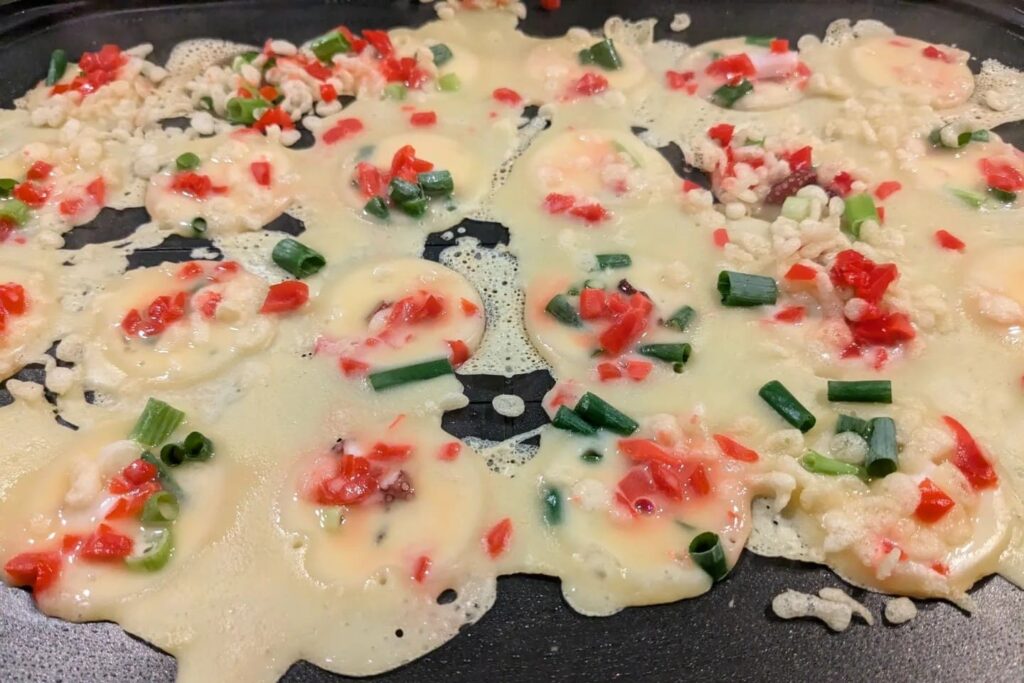 เมื่อเทแป้งลงในหลุมเตาจนเต็มแล้ว ลำดับการใส่ไส้มีผลต่อรสชาติและโครงสร้างภายในอย่างมาก คำแนะนำคือควรใส่ปลาหมึกยักษ์ลงไปเป็นอันดับแรกเพื่อให้เนื้อปลาหมึกได้สัมผัสกับความร้อนของเตาโดยตรงผ่านชั้นแป้งบางๆ ซึ่งจะช่วยดึงกลิ่นหอมและรสหวานออกมาได้ดีกว่า จากนั้นจึงตามด้วยเครื่องเคียงอื่นๆ อย่างขิงดอง ต้นหอม และที่ขาดไม่ได้คือเกล็ดแป้งเทมปุระทอดที่จะต้องใส่ลงไปเป็นลำดับสุดท้ายก่อนเริ่มการพลิก เพื่อให้มันคงความกรอบมันและไม่เละรวมไปกับแป้งจนเสียเนื้อสัมผัส