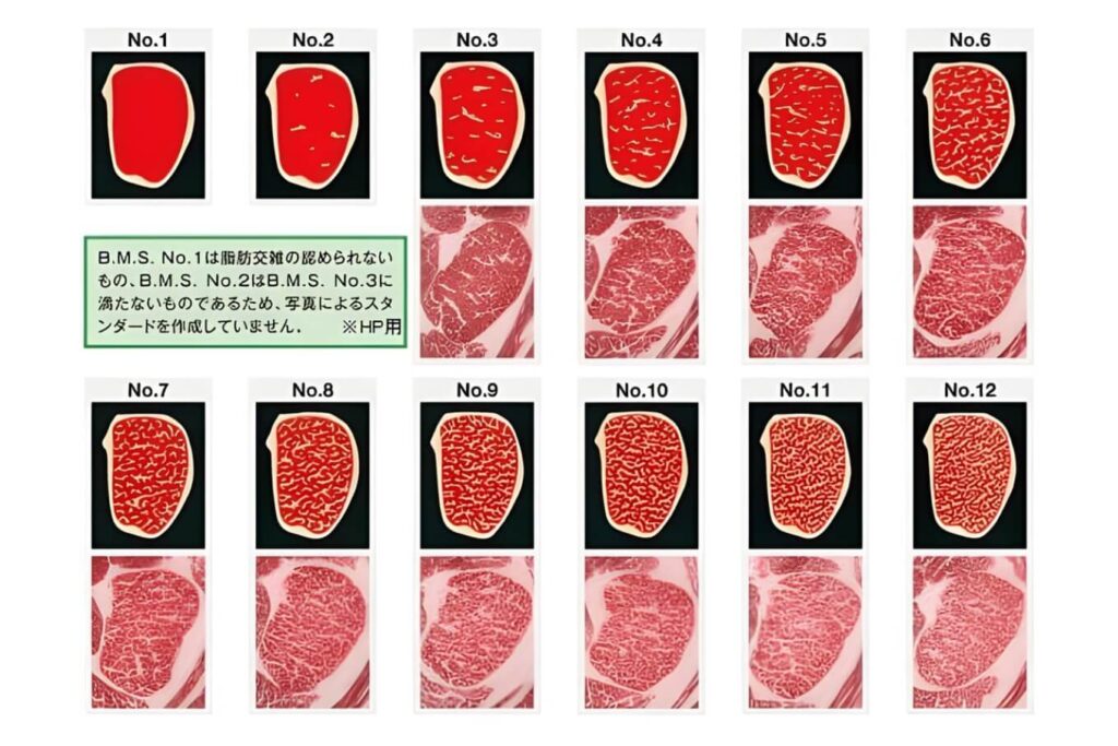 ถ้าเลข 5 คือที่สุดของระดับคุณภาพ ในบรรดาเนื้อเกรด 5 เองก็ยังมีการแบ่งแยกย่อยลงไปอีกด้วยค่า BMS หรือระดับไขมันแทรก ซึ่งมีสเกลตั้งแต่ 1 ไปจนถึง 12 ค่านี้คือตัวตัดสินว่าเนื้อวากิวชิ้นนั้นมีลายหินอ่อนหนาแน่นขนาดไหน สำหรับเนื้อระดับ A5 จะต้องมีค่า BMS อยู่ในช่วง 8 ถึง 12 เท่านั้น หากได้ค่า BMS 12 ถือว่าเป็นจุดสูงสุดของเนื้อวากิว ลายไขมันจะแทรกซึมหนาแน่นจนดูเหมือนเนื้อสีขาวมากกว่าสีแดง รสชาติจะมีความครีมมี่และนุ่มละมุนที่สุด