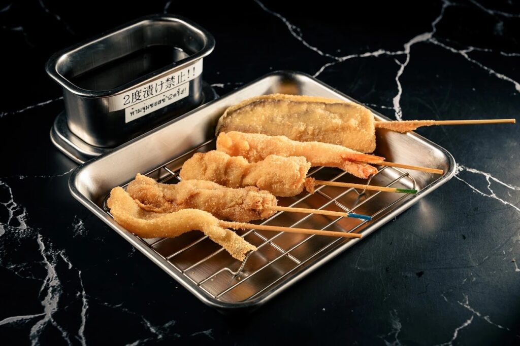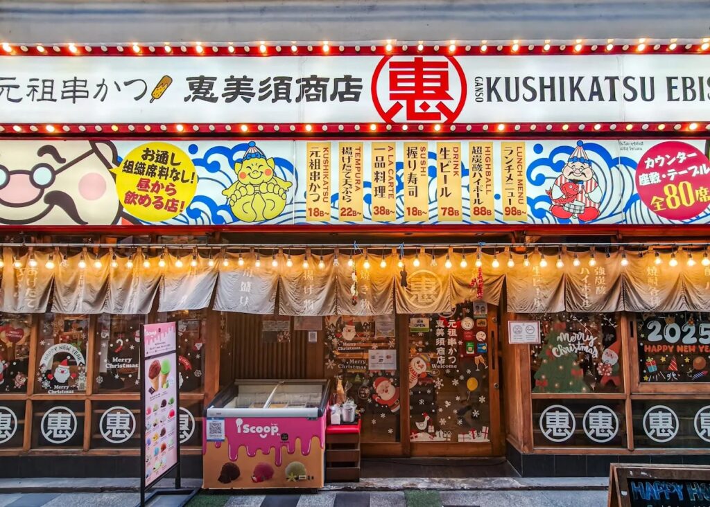 ขอเปิดร้านแรกด้วย EBISU SHOTEN ร้านอิซากายะสุดชิค ที่พอก้าวเข้าไปในร้านปุ๊ป เหมือนหลุดไปอยู่ญี่ปุ่นเลยทีเดียว บรรยากาศภายในร้านก็ดีมาก ๆ เหมาะกับการมาสังสรรค์กับแก๊งเพื่อนหรือมาเดทแบบสบาย ๆ ในยามเย็น จุดเด่นของที่นี่คือความเป็นอิซากายะสไตล์ฮอกไกโดแท้ ๆ ที่เสิร์ฟเมนูอร่อย ๆ ไม่ว่าจะเป็นของทอดเสียบไม้ หรือที่เรียกกันว่า คุชิคัตสึ (Kushikatsu) ที่ราคาเริ่มต้นแค่ไม้ละ 18 บาทเท่านั้น ของทะเลก็สดมาก ไม่ว่าจะเป็นปลาดิบรวม แซลมอน หรือหอยนางรมสด ที่หลายคนติดใจ นอกจากอาหารจานเด็ดแล้ว ที่นี่ก็เป็นสวรรค์ของสายดื่ม เพราะมีเบียร์สดและเครื่องดื่มอื่น ๆ ให้เลือกเพียบ และที่สำคัญคือเดินทางง่ายมาก ๆ เพราะร้านตั้งอยู่ที่โครงการ Summer Hill ติดกับ BTS พระโขนง ทางออก 4 เลย ราคาต่อหัวจะอยู่ที่ประมาณ 500 บาท