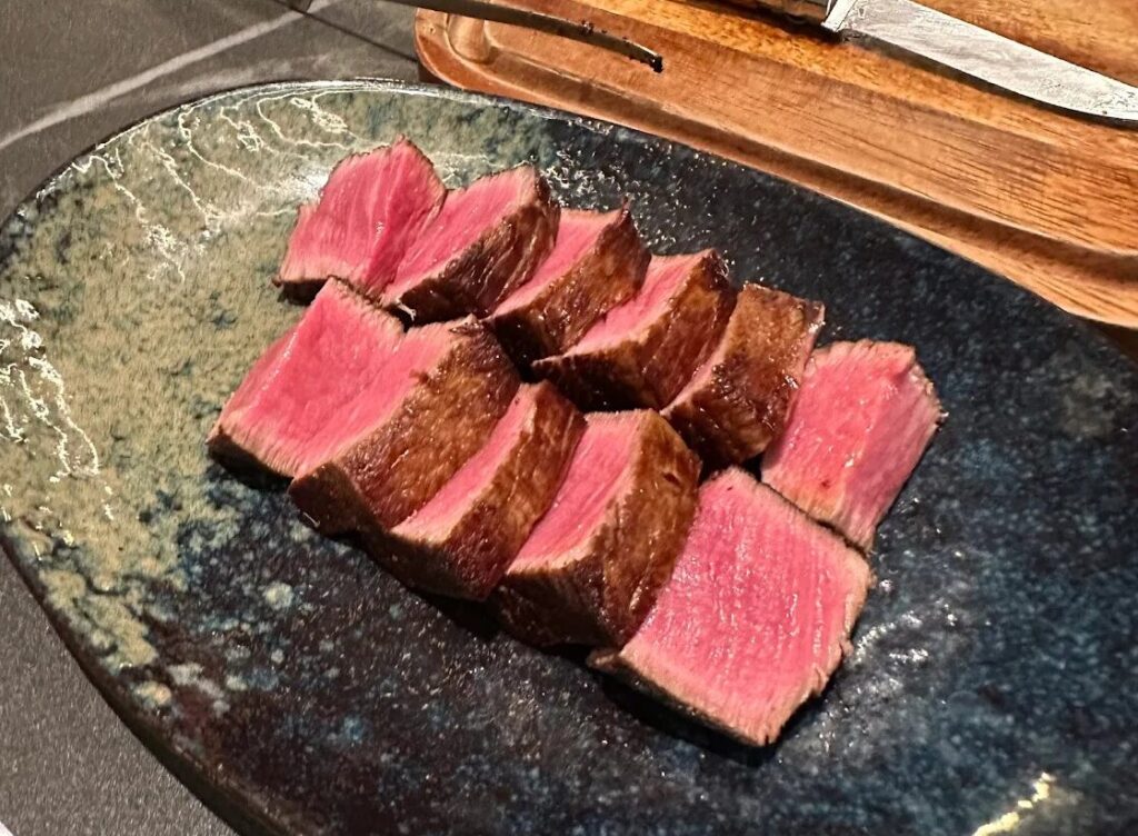 ร้านนี้เป็นร้านดังที่ส่งตรงมาจากเมืองฟุกุโอกะ มาในคอนเซ็ปต์ โอมากาเสะเนื้อย่าง (Omakase Yakiniku) ที่เชฟจะเลือกเนื้อคุณภาพเยี่ยมและพิถีพิถันย่างให้ทานทีละคำ จุดเด่นคือการใช้เนื้อคุณภาพสูง โดยเฉพาะเนื้อวากิว A5 และเนื้อชั้นดีที่นำเข้ามาแบบไม่แช่แข็ง ทำให้รสชาติและสัมผัสของเนื้อที่ดีงามสุด ๆ ในคอร์สโอมากาเสะ ผ่านเทคนิคการย่างหลายเทคนิค และเครื่องเคียงที่เชฟตั้งใจจับคู่มาให้ เมื่อทานเนื้อเสร็จแล้ว ก็ปิดท้ายคอร์สด้วยเมนูเด็ดอย่าง พุดดิ้งนม อันโด่งดังของร้าน ใครที่อยากลองโอมากาเสะปิ้งย่าง ต้องรีบมาที่นี่เลย ราคาต่อหัวจะอยู่ที่ประมาณ 2,500-3,500 บาท